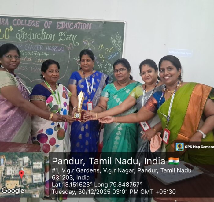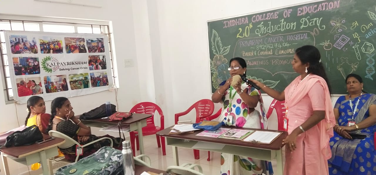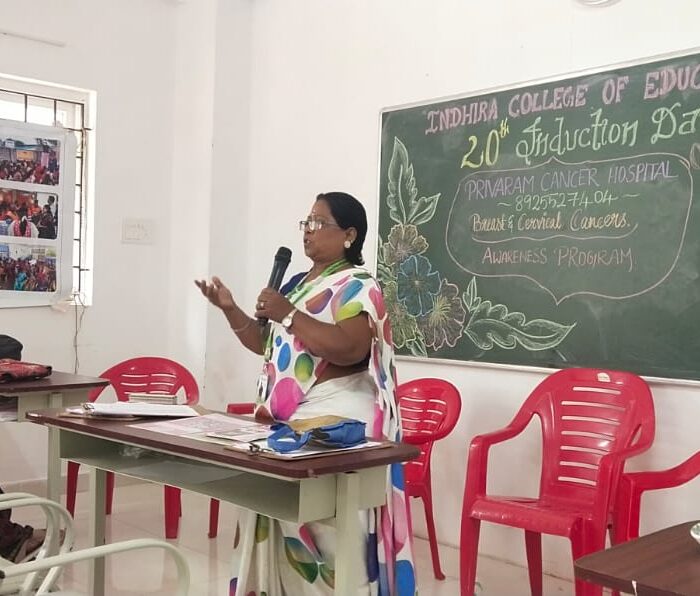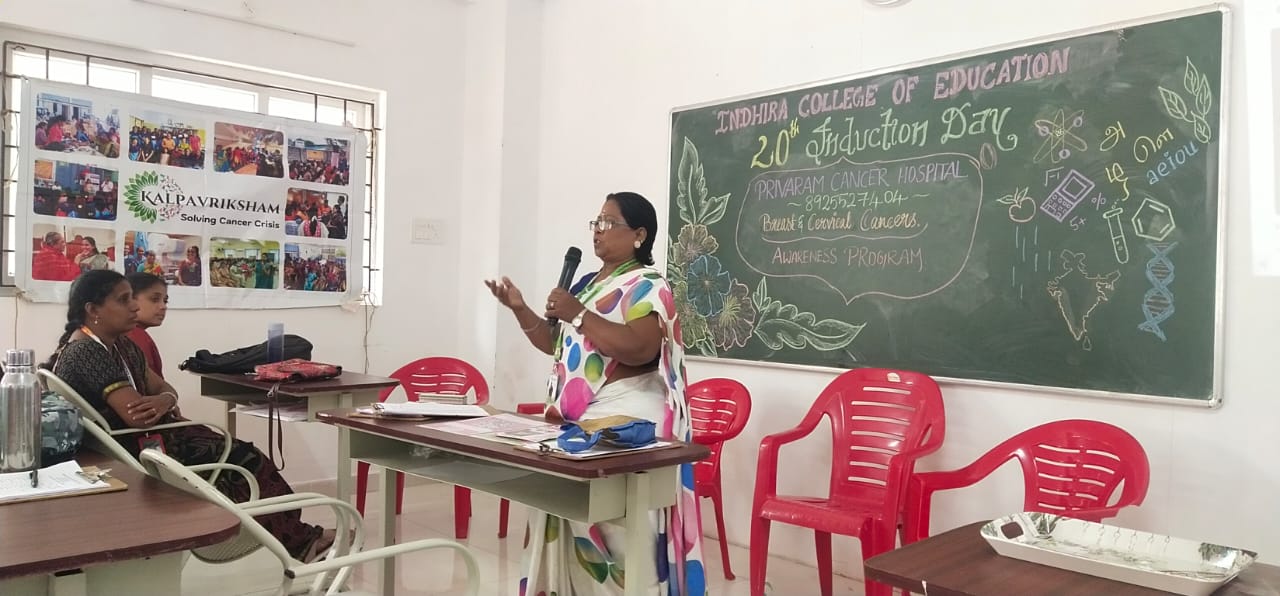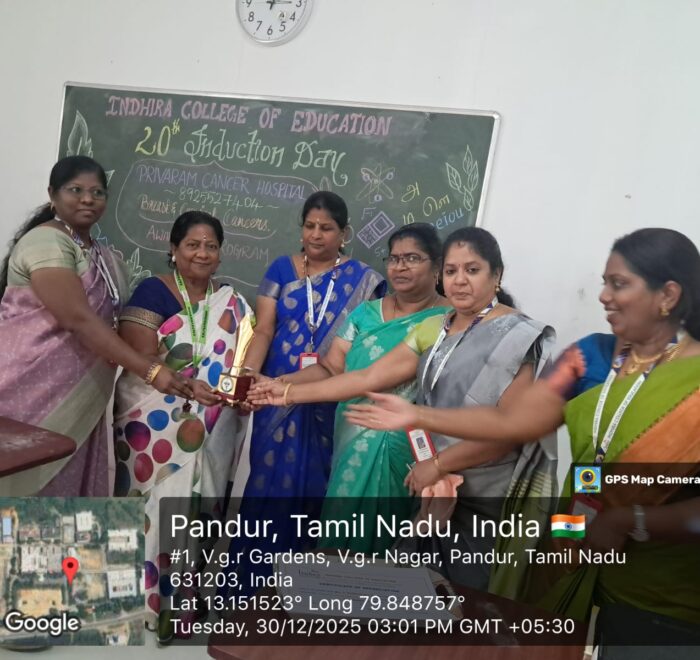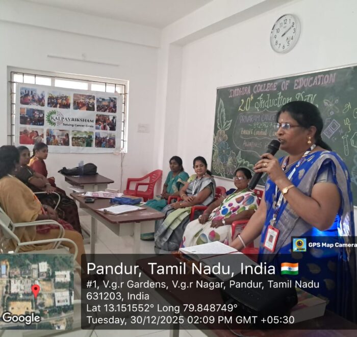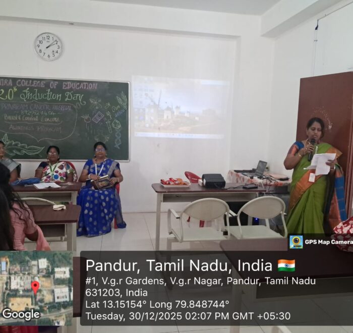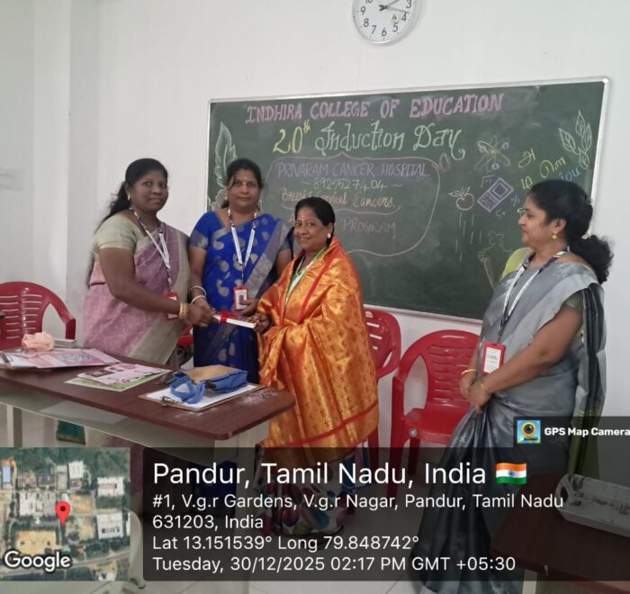 On Tuesday, December 30, 2025, “A vital Cancer Awareness Programme” was organized at Indhira College of Education, Pandur. The session was led by Mrs. C. Shanthi, Senior Consultant at Privaram Cancer and Research Institute, Valasaravakkam.